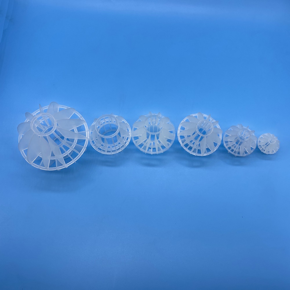 該產(chǎn)品采用聚丙烯塑料制成球狀,在球中部沿整個(gè)周長(zhǎng)有一道加固環(huán),環(huán)的上下各有十二片球瓣,沿中心軸呈放射性布置,由于表面積大,傳質(zhì)效率高,產(chǎn)品的球瓣于球瓣之間空間大,且重量輕 強(qiáng)度大,安裝方便,耐高溫 耐腐蝕,性能穩(wěn)定。